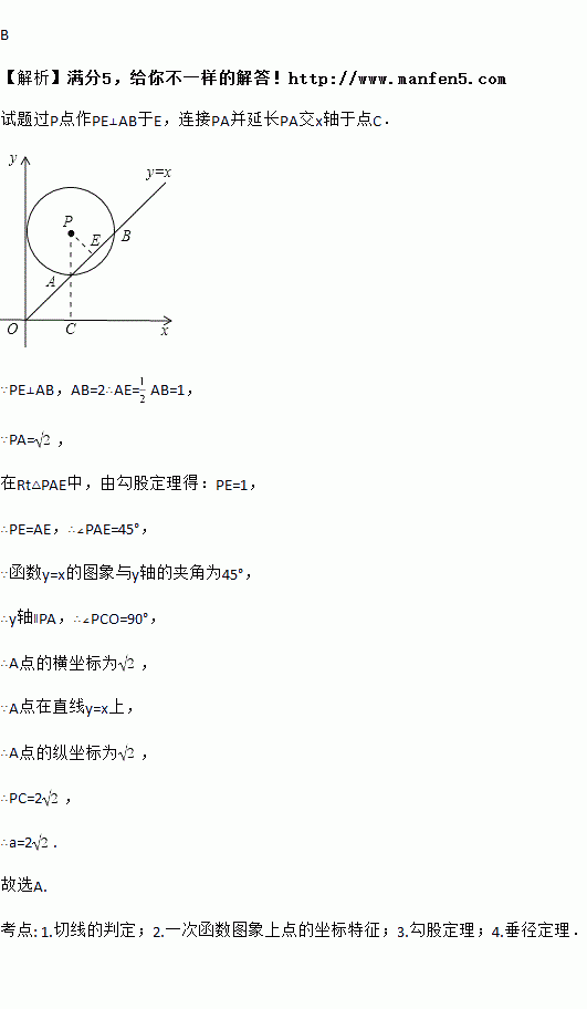 如图,在平面直角坐标系中,⊙P的圆心是(2,a)(a>2),半径为2,函数y=x的图象被⊙P截得的弦AB的长为2,则a的值是( )