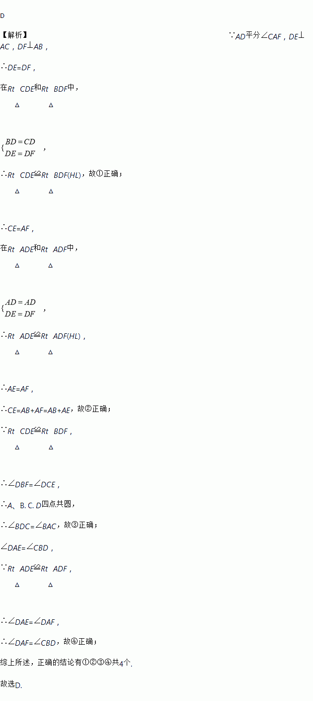 D 【解析】∵AD平分∠CAF,DE⊥AC,DF⊥AB, ∴DE=DF, 在Rt△CDE和Rt△BDF中, , ∴Rt△CDE≌Rt△BDF(HL),故①正确; ∴CE=AF, 在Rt△ADE和Rt△ADF中, , ∴Rt△ADE≌Rt△ADF(HL), ∴AE=AF, ∴CE=AB+AF=AB+AE,故②正确; ∵Rt△CD...
