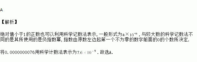 世界上最小的开花结果植物是澳大利亚的出水浮萍,这种植物的果实像一个微小的无花果,质量只有0.0000000076克,将数0.0000000076用科学记数法表示为( )