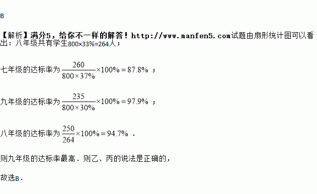 某校公布了该校反映各年级学生体育达标情况的两张统计图(如图),该校七、八、九三个年级共有学生800人.甲、乙、丙三个同学看了这两张统计图后,甲说:“七年级的体育达标率最高.”乙说:“八年级共有学生264人.”丙说:“九年级的体育达标率最高.”甲、乙、丙三个同学中,说法正确的是( )