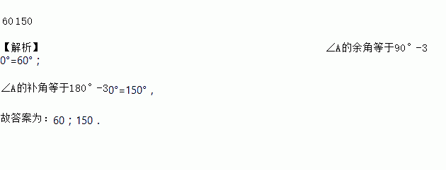 60 150 【解析】∠A的余角等于90°-30°=60°; ∠A的补角等于180°-30°=150°, 故答案为:60;150.