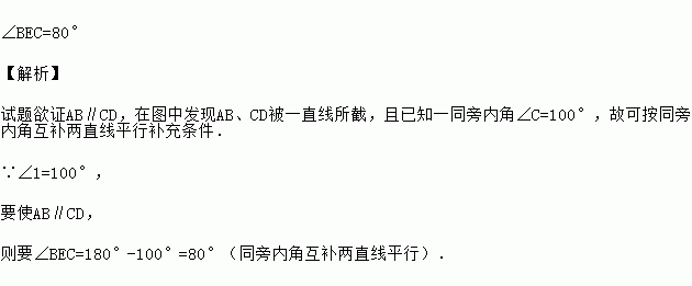 如图所示,已知∠C=100°,若增加一个条件,使得AB∥CD,试写出符合要求的一个条件: .