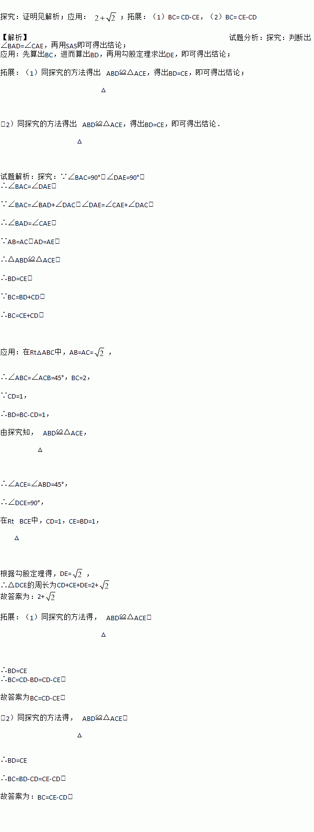 探究:如图①,当点D在线段BC上时,证明BC=CE+CD.
