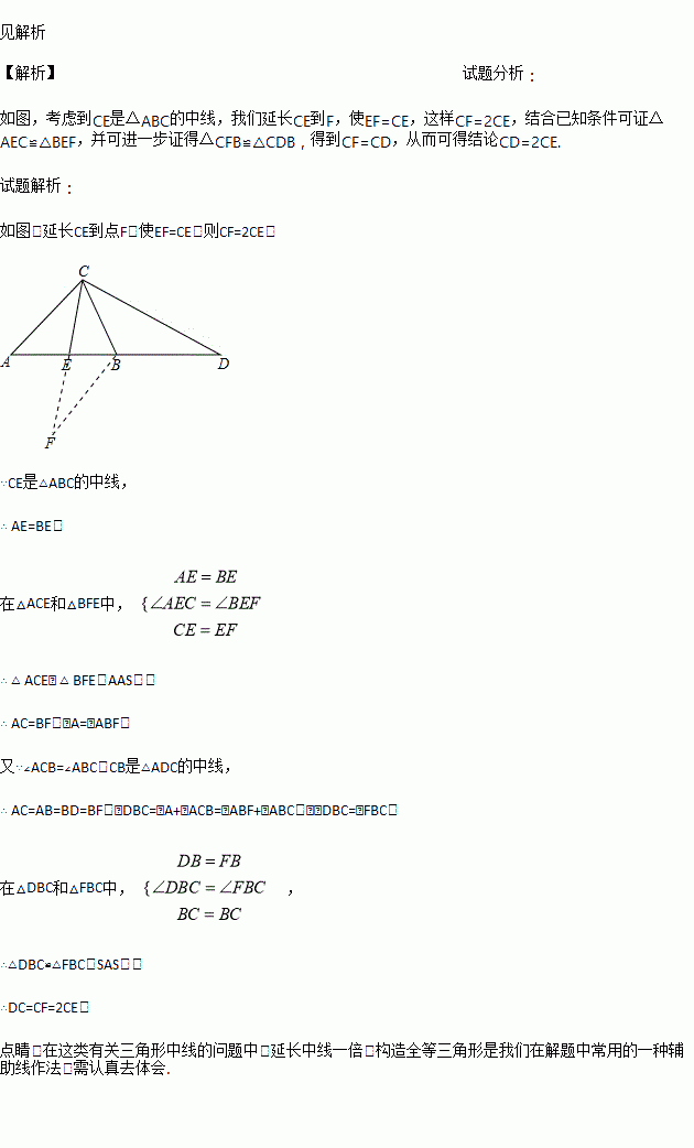 如图,CE、CB分别是△ABC与△ADC的中线,且∠ACB=∠ABC.求证:CD=2CE.