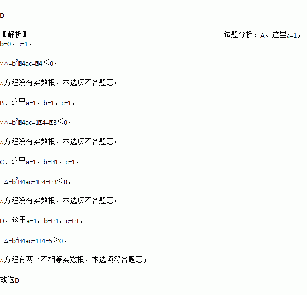 A. x2+1=0 B. x2+x+1=0 C. x2﹣x+1=0 D. x2﹣x﹣1=0