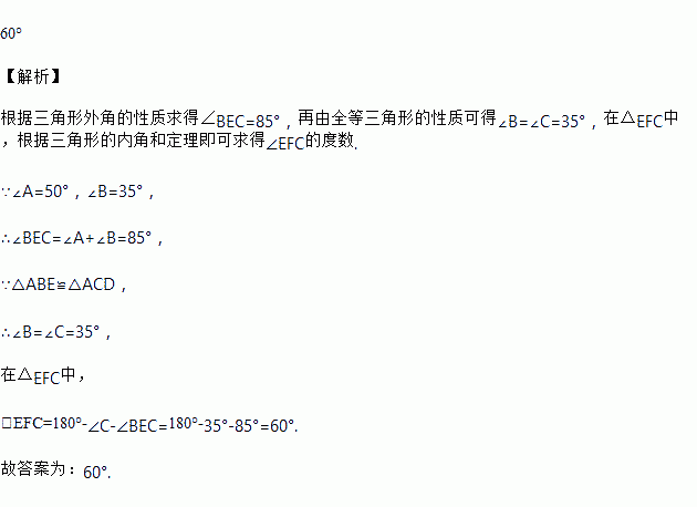 如图,点D、E分别在AB、AC上,CD、BE相交于点F,若△ABE≌△ACD,∠A=50°,∠B=35°,则∠EFC的度数为_____.