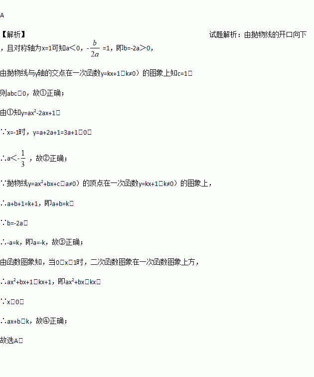 如图,抛物线y=ax2+bx+c(a≠0)的顶点和该抛物线与y轴的交点在一次函数y=kx+1(k≠0)的图象上,它的对称轴是x=1,有下列四个结论:①abc<0,②a<﹣