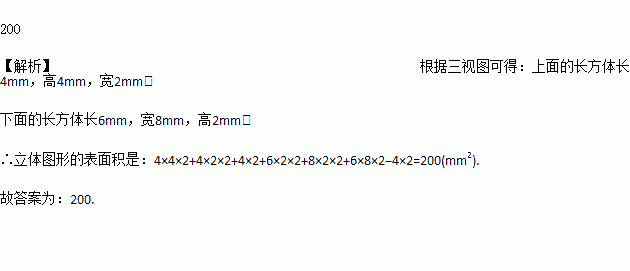 如图是由两个长方体组合而成的一个立体图形的三视图.根据图中所标尺寸(单位:mm),计算出这个立体图形的表面积是______mm2.