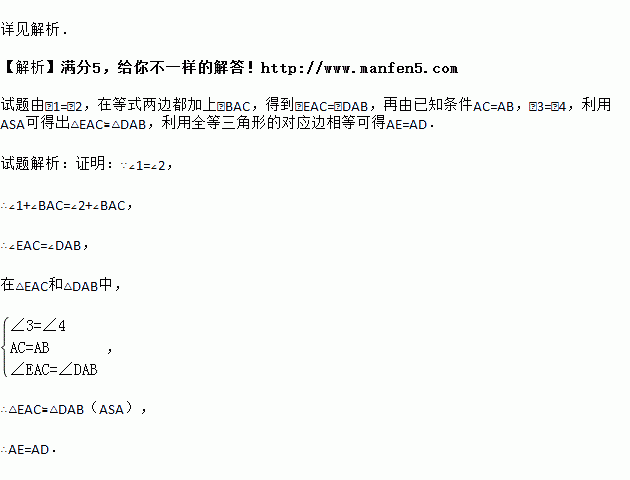 已知:如图,AC=AB,∠1=∠2,∠3=∠4.