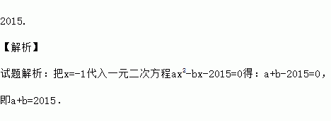 2015. 【解析】 试题解析:把x=-1代入一元二次方程ax2-bx-2015=0得:a+b-2015=0, 即a+b=2015.