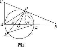 (2)连DE、ME,易得当ED和EM为等腰三角形EDM的两腰,根据垂径定理得推论得OE⊥DM,易得到△ADC为等边三角形,得∠CAD=60°,则∠DAO=30°,∠DON=60°,然后根据含30°的直角三角形三边的关系得DN=