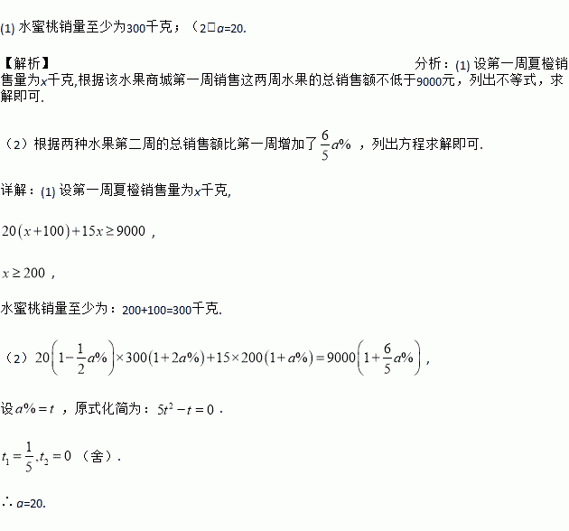 (1)某水果商城抓住商机,开始销售这两种水果.若第一周水蜜桃的平均销量比夏橙的平均销量多100千克,要使该水果商城第一周销售这两周水果的总销售额不低于9000元,则第一周至少销售水蜜桃多少千克?