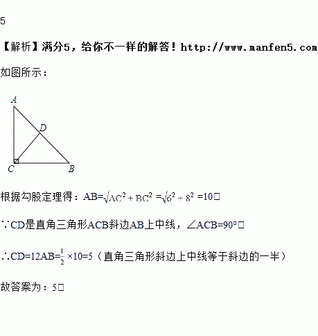 在直角△ABC中,两条直角边的长分别是6、8,则斜边上的中线长是__________。