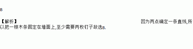 B 【解析】因为两点确定一条直线,所以把一根木条固定在墙面上,至少需要两枚钉子故选B.