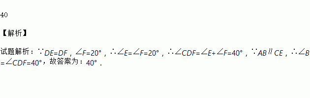 如图,AB∥CE,BF交CE于点D,DE=DF,∠F=20°,则∠B的度数为__°.
