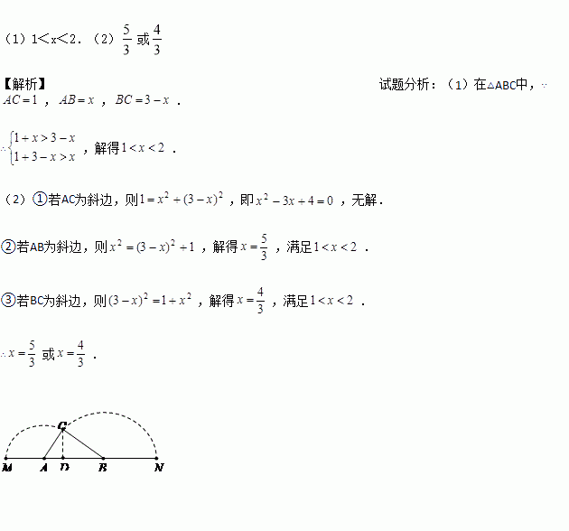 如图,已知A、B是线段MN上的两点,MN=4,MA=1,MB>1.以A为中心顺时针旋转点M,以B为中心逆时针旋转点N,使M、N两点重合成一点C,构成△ABC,设AB=x.