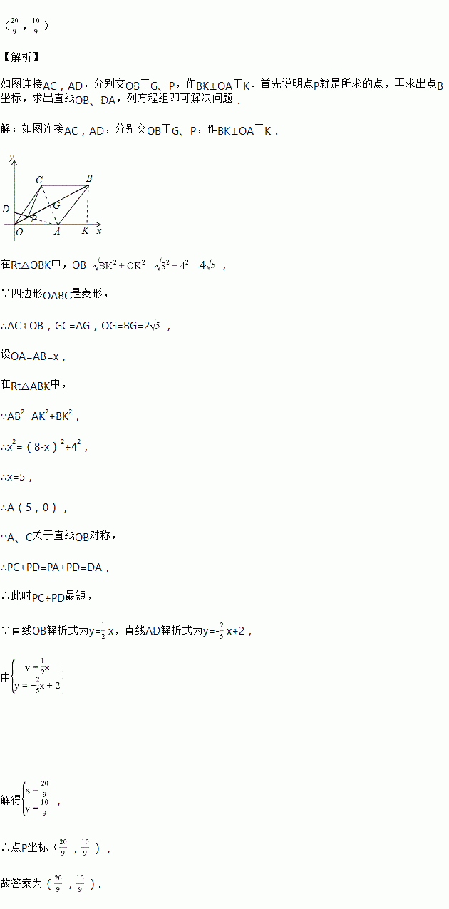 如图,已知菱形OABC的边OA在x轴上,点B的坐标为(8,4),P是对角线OB上的一个动点,点D(0,1)在y轴上,当PC+PD最短时,点P的坐标为________.