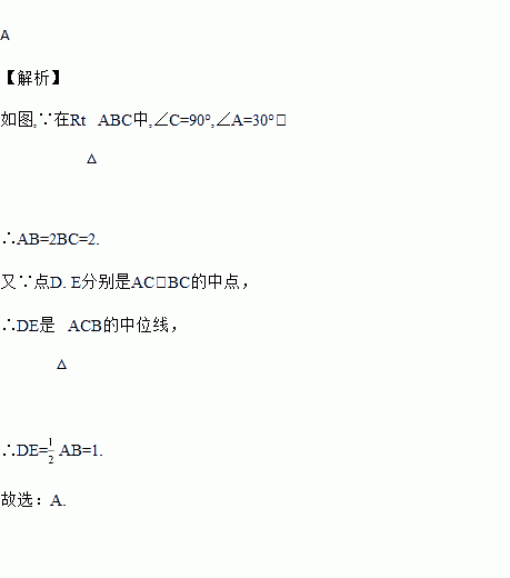 如图,在Rt△ABC中,∠A=30°,BC=1,点D,E分别是直角边BC,AC的中点,则DE的长为( )