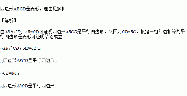 如图所示,在四边形ABCD中,AB∥CD,AB=CD=BC,四边形ABCD是菱形吗?说明理由.