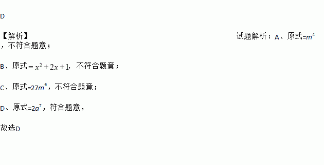 A. m6÷m2=m3 B. (x+1)2=x2+1 C. (3m2)3=9m6 D. 2a3•a4=2a7