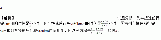 某次列车平均提速vkm/h,用相同的时间,列车提速前行驶skm,提速后比提速前多行驶50km.设提速前列车的平均速度为xkm/h,则列方程是