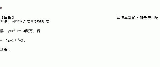 B 【解析】解决本题的关键是使用配方法,可得顶点式函数解析式. 【解析】 y=x2-2x+4配方,得 y=(x-1)2+3, 故选B.