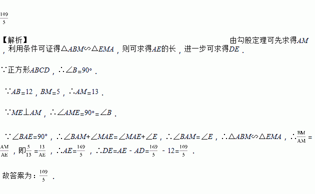 如图,正方形ABCD中,M为BC上一点,ME⊥AM,垂足为M,ME交AD的延长线于点E.若AB=12,BM=5,则DE的长为_____.