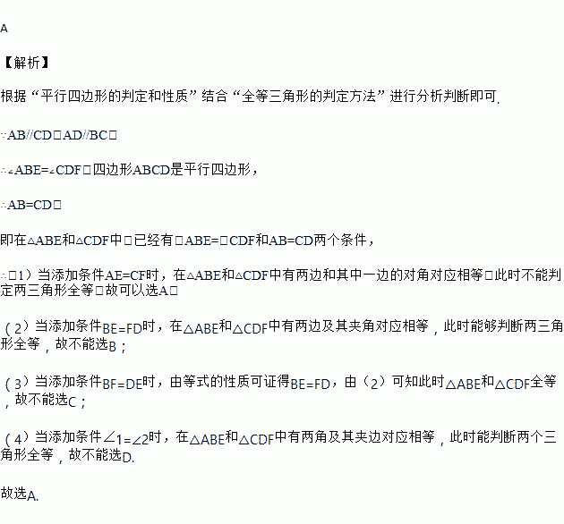 A. AE=CF B. BE=FD C. BF=DE D. ∠1=∠2