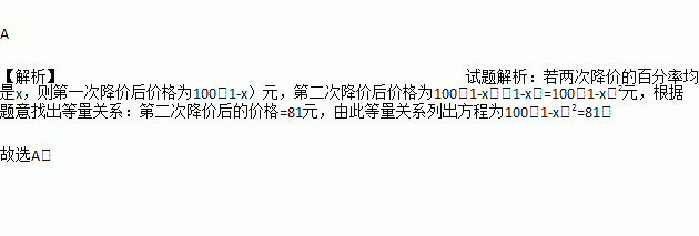 某药品经过两次降价,每瓶零售价由100元降至81元.已知平均两次降价的百分率为,则所满足的方程是( )