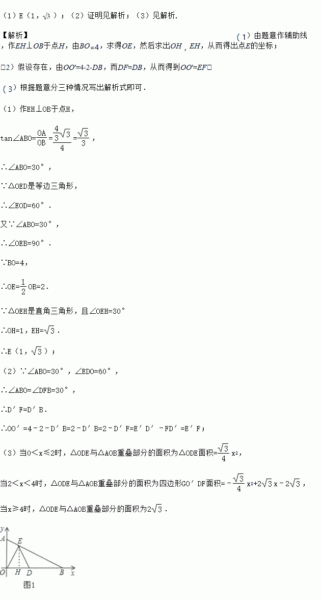 ,OB=4,分别以OA、OB边所在的直线建立平面直角坐标系,D为x轴正半轴上一点,以OD为一边在第一象限内作等边△ODE.