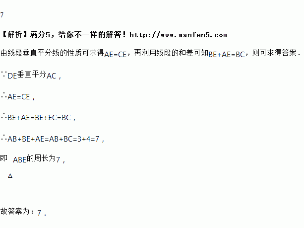 如图所示,在△ABC中,∠B=90°,AB=3,BC=4,线段AC的垂直平分线DE交AC于D,交BC于E,连接AE,则△ABE的周长为_____.