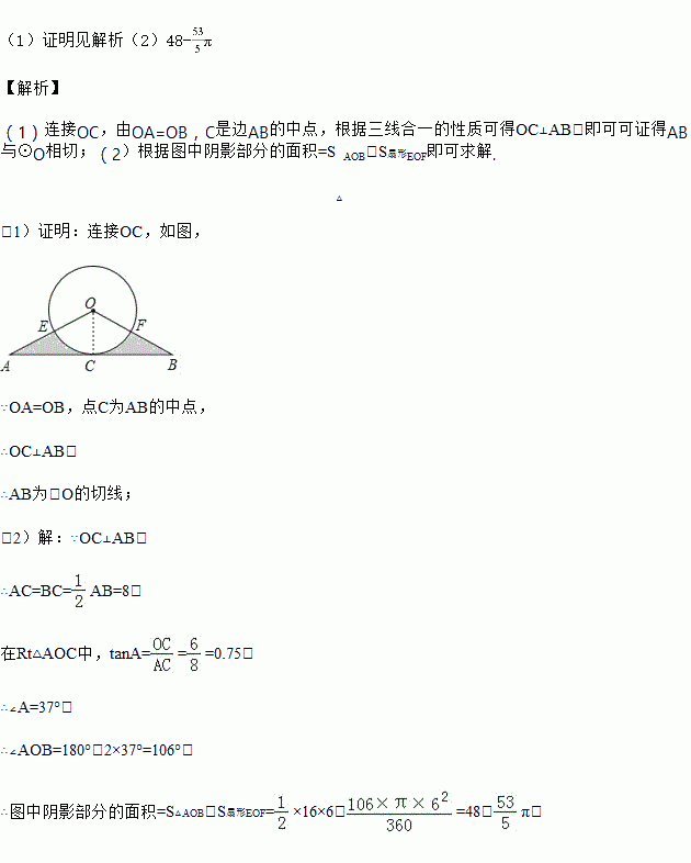 如图,在△AOB中,OA=OB,点C为AB的中点,AB=16,以点O为圈心,6为半径的圆经过点C,分别交OA、OB于点E、F.