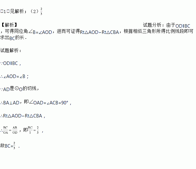 如图,AB是⊙O的直径,AD是⊙O的切线,点C在⊙O上,BC∥OD,AB=2,OD=3.