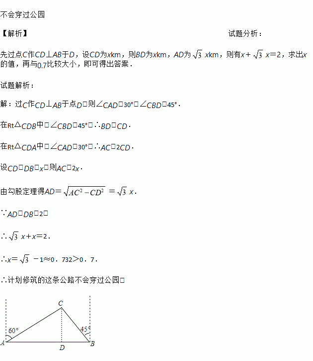 如图,某市为方便相距2 km的A,B两处居民区的交往,修筑一条笔直的公路(即图中的线段AB),经测量,在A处的北偏东60°方向、B处北偏西45°方向的C处有一半径为0.7 km的圆形公园,问计划修筑的公路会不会穿过公园?为什么?