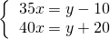 某汽车制造厂接受了在预定期限内生产一批汽车的任务,如果每天生产35辆,则差10辆才能完成任务;如果每天生产40辆,则可超额生产20辆.若设预定期限是x天,计划生产y辆汽车,依题意可列方程组________.