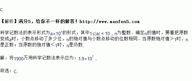 2017年中秋小长假长沙县的旅游收入约为1900万,将1900万用科学记数法表示应为( )