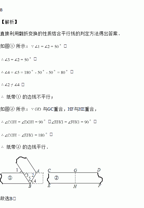 一次数学活动中,检验两条纸带①、②的边线是否平行,小明和小丽采用两种不同的方法如图:小明对纸带①沿AB折叠,量得∠1=∠2=50°;小丽对纸带②沿GH折叠,发现GD与GC重合,HF与HE重合.则下列判断正确的是( )