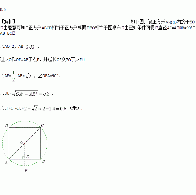 如图,用一块直径为4米的圆桌布平铺在对角线长为4米的正方形桌面上,若四周下垂的最大长度相等,则这个最大长度x为__________米 (取 1.4 ).