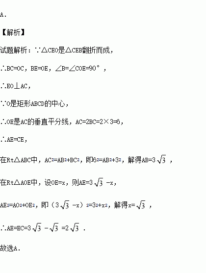 如图,点O是矩形ABCD的中心,E是AB上的点,沿CE折叠后,点B恰好与点O重合,若BC=3,则折痕CE的长为( )