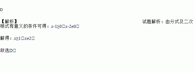 A. x>1且x≠2 B. x≥1 C. x≠2 D. x≥1且x≠2