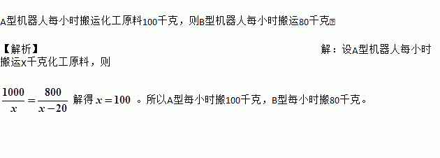 A、B两种机器人都被用来搬运化工原料,A型机器人比B型机器人每小时多搬运20千克,A型机器人搬运1000千克所用时间与B型机器人搬运800千克所用时间相等,两种机器人每小时分别搬运多少化工原料?