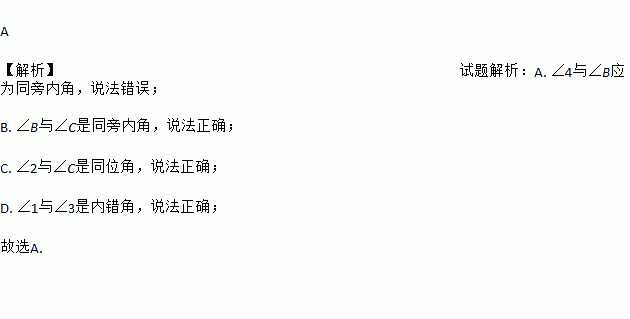 A. ∠4与∠B是同位角 B. ∠B与∠C是同旁内角 C. ∠2与∠C是同位角 D. ∠1与∠3是内错角