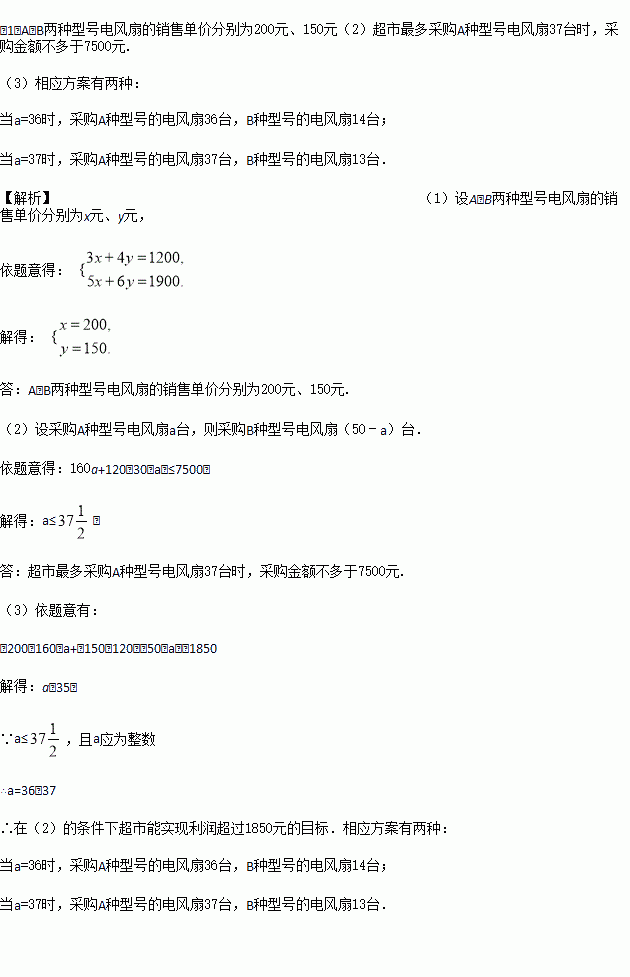 (2)若商场准备用不多于7500元的金额再采购这两种型号的电风扇共50台,求A种型号的电风扇最多能采购多少台?