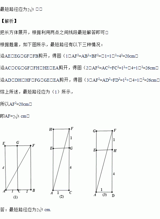 已知长方体的长为1cm、宽为1cm、高为4cm(其中AC=1cm,BC=1cm,CG=4cm).一只蚂蚁如果沿长方体的表面从A点爬到F点,最短的路程是多少?