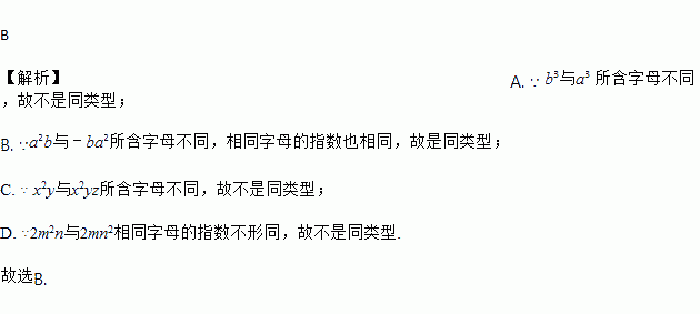 B 【解析】A. ∵ b3与a3 所含字母不同,故不是同类型; B. ∵a2b与﹣ba2所含字母不同,相同字母的指数也相同,故是同类型; C. ∵ x2y与x2yz所含字母不同,故不是同类型; D. ∵2m2n与2mn2相同字母的指数不形同,故不是同类型. 故选B.