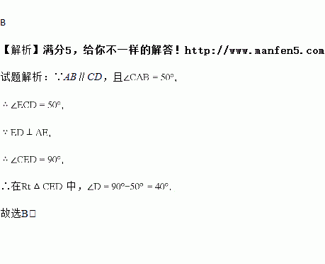 如图,已知AB∥CD,DE⊥AF,垂足为E,若∠CAB=50°,则∠D的度数为( )