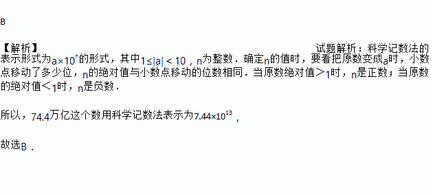 B 【解析】试题解析:科学记数法的表示形式为a×10n的形式,其中1≤|a|<10,n为整数.确定n的值时,要看把原数变成a时,小数点移动了多少位,n的绝对值与小数点移动的位数相同.当原数绝对值>1时,n是正数;当原数的绝对值<1时,n是负数. 所以,74.4万亿这个数用科学记数法表示为7.44×1013, 故选B.