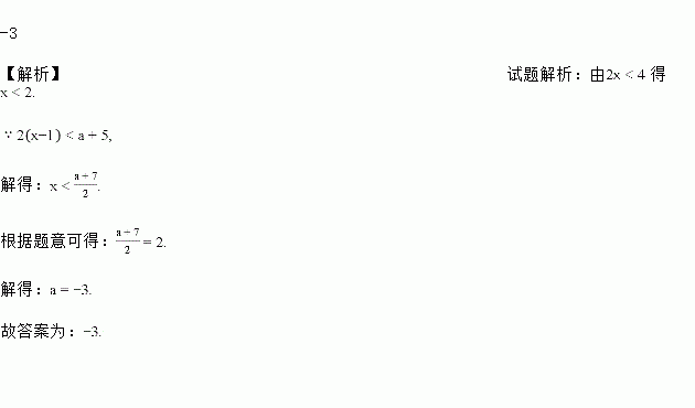 如果关于x的不等式2(x-1)<a+5与2x<4的解集相同,则a的值为_________.