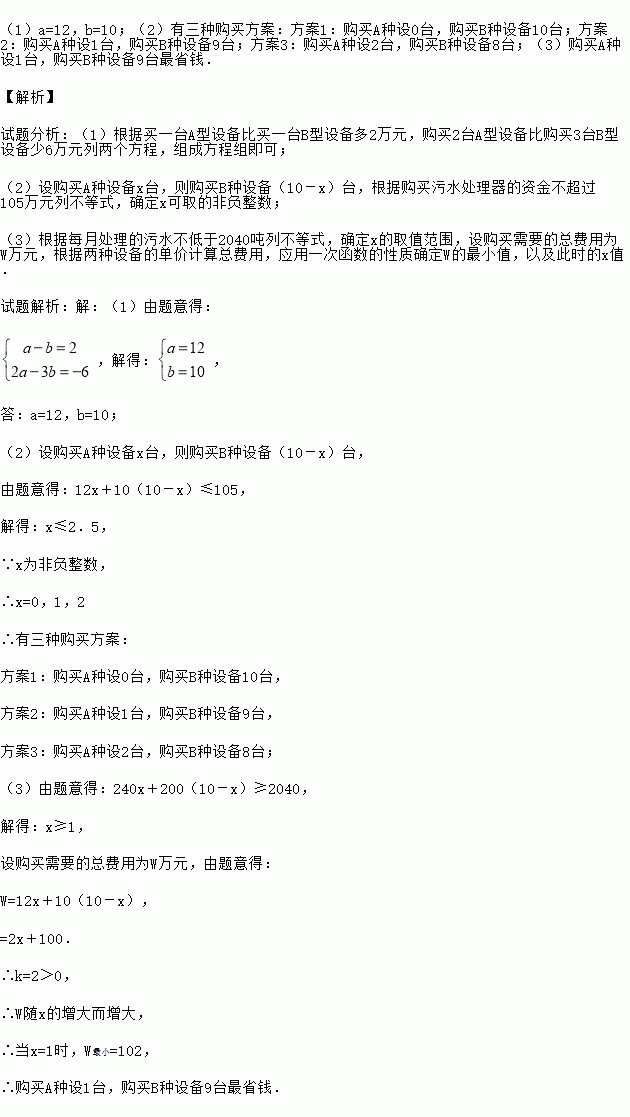 为了更好地治理小凌河水质,保护环境,市治污公司决定购买10台污水处理设备,现有A 、B两种设备,A 、B单价分别为a万元/台、 b万元/台,月处理污水分别为240吨/月、200吨/月,经调查,买一台A型设备比买一台B型设备多2万元,购买2台A型设备比购买3台B型设备少6万元.
