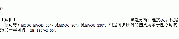 如图,A、B、C、D四个点均在⊙O上,∠AOD=50°,AO∥DC,则∠B的度数为( )